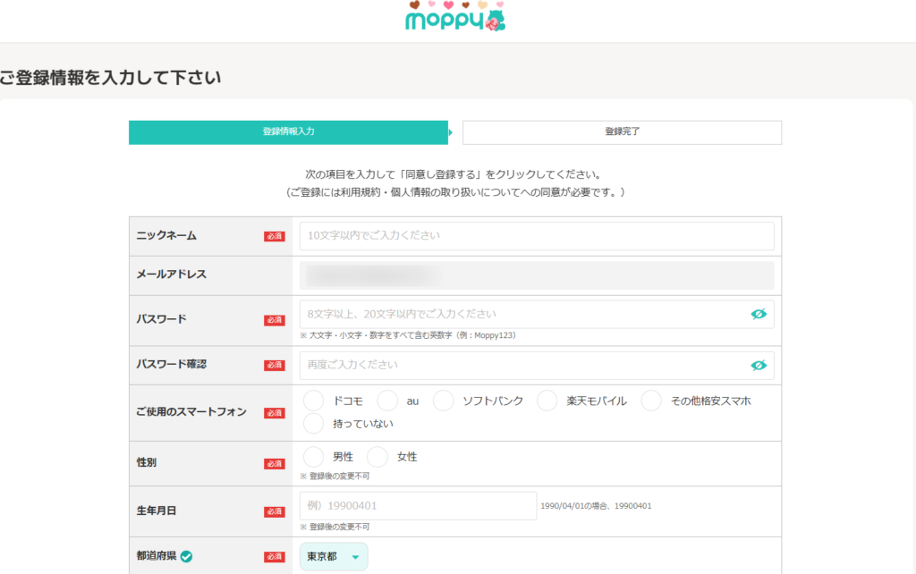メール認証が終了したら、次はモッピー内で使用するニックネームやパスワードなどの会員情報を入力します。