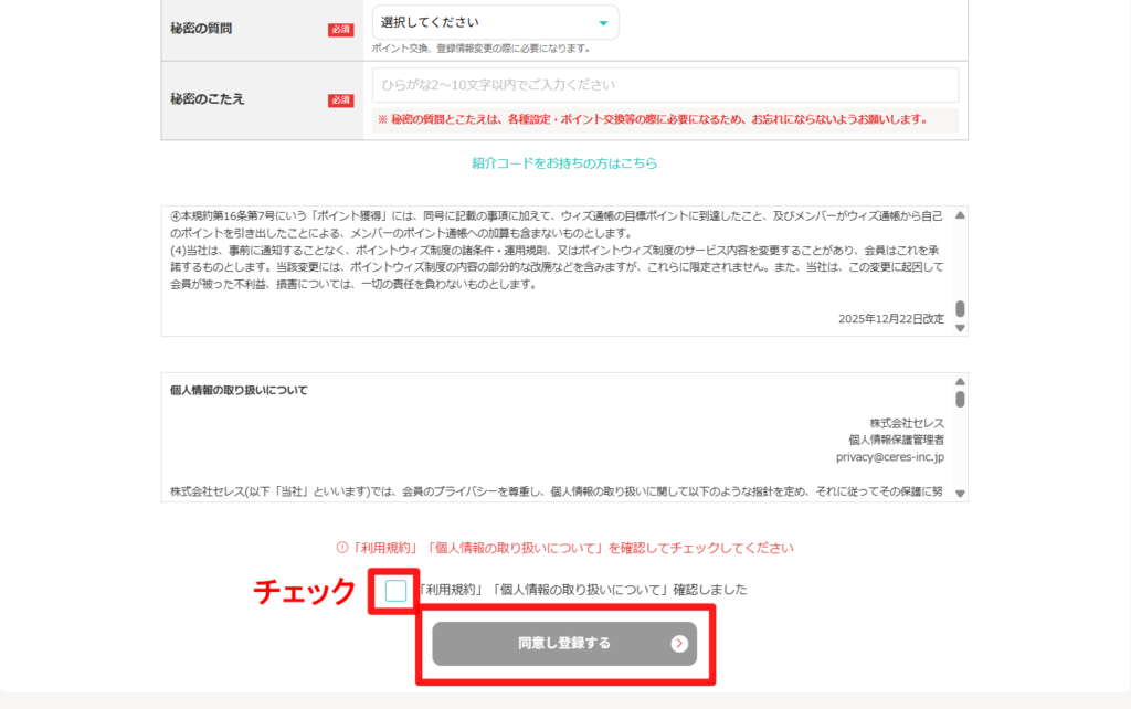「秘密の質問」と「秘密の答え」は、登録情報変更やポイント交換時に必要になります。必ずメモを取るなどして忘れないように管理しましょう。